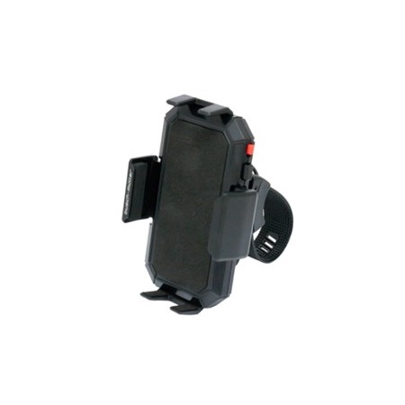 Universalhållare för mobiltelefoner, bilnavigeringssystem och liknande anordningar. Enkel montering utan verktyg. Sitter stadigt även på ojämna vägar och i terräng.