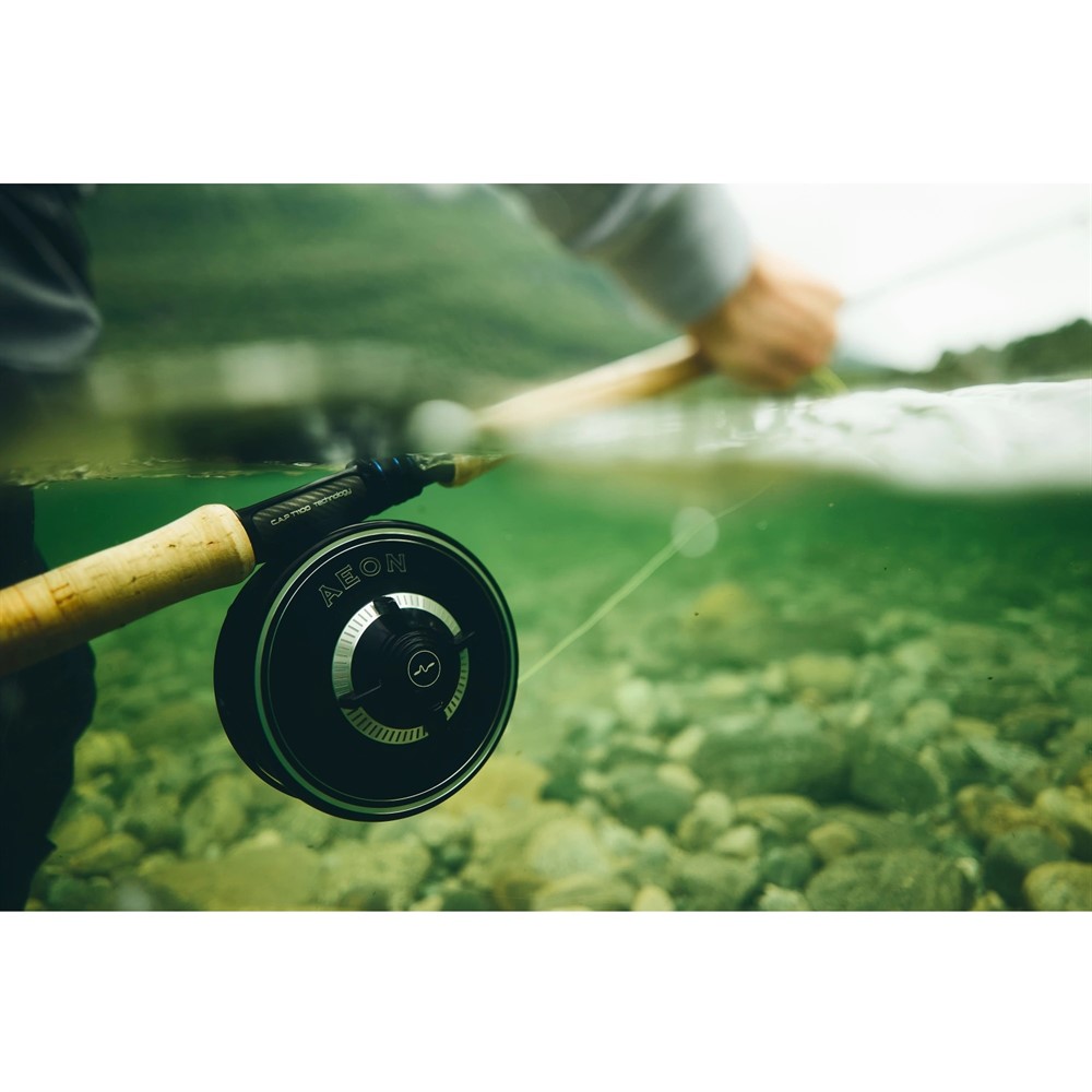 Aeon-rullen är en fusion av tidlös skandinavisk design och avancerad teknik. Den främre sidan har en Fibonacci-mönstrad öppning och organiska former som ger ett elegant utseende. Baksidan kombinerar matta och blanka ytor med en dubbelfärgad anodisering på bromsindikatorn. Det kraftfulla kolfiberbromssystemet med 7,5 kg bromskraft är förseglat och hanterar även de största fiskarna. Anti-snag-funktionerna på spolkärnan och bromsknappen minskar lintrassel, och ljudet är noga justerat för att ge en klassisk Guideline-ton.