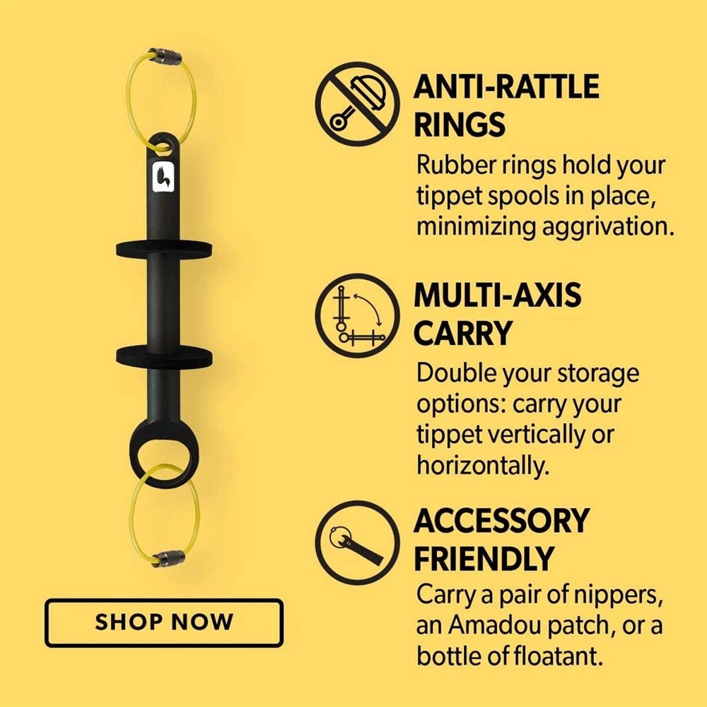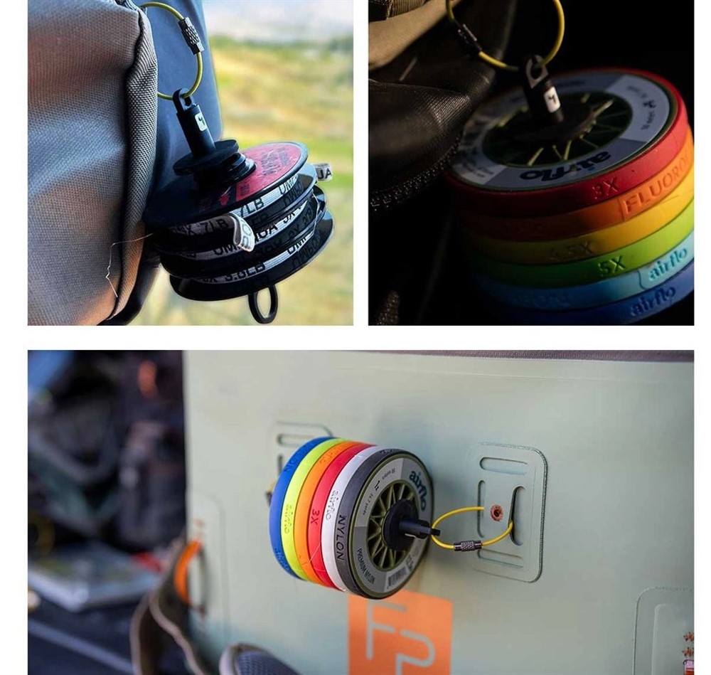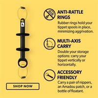 Loon Rogue Tippet Post ger dig två alternativ: använd verktygsbanden i rostfritt stål för att fästa båda ändarna på en ryggsäck så att din Tippet Post sitter horisontellt, eller fäst ena änden på en ryggsäck och använd den andra änden för att förvara flytmedel, nippers eller andra tillbehör.