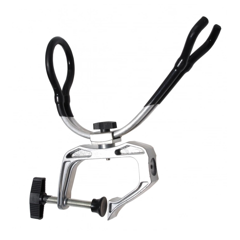 Spöhållare med skruvtvingsfäste. Har fast hållare bak och fram, justerbar i infästningen.