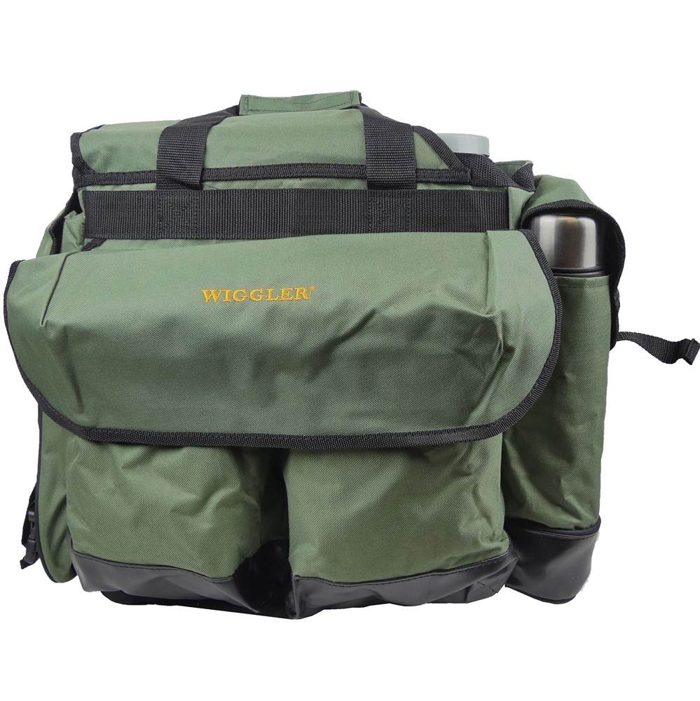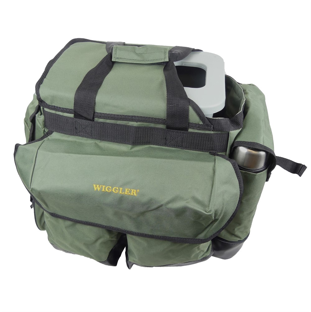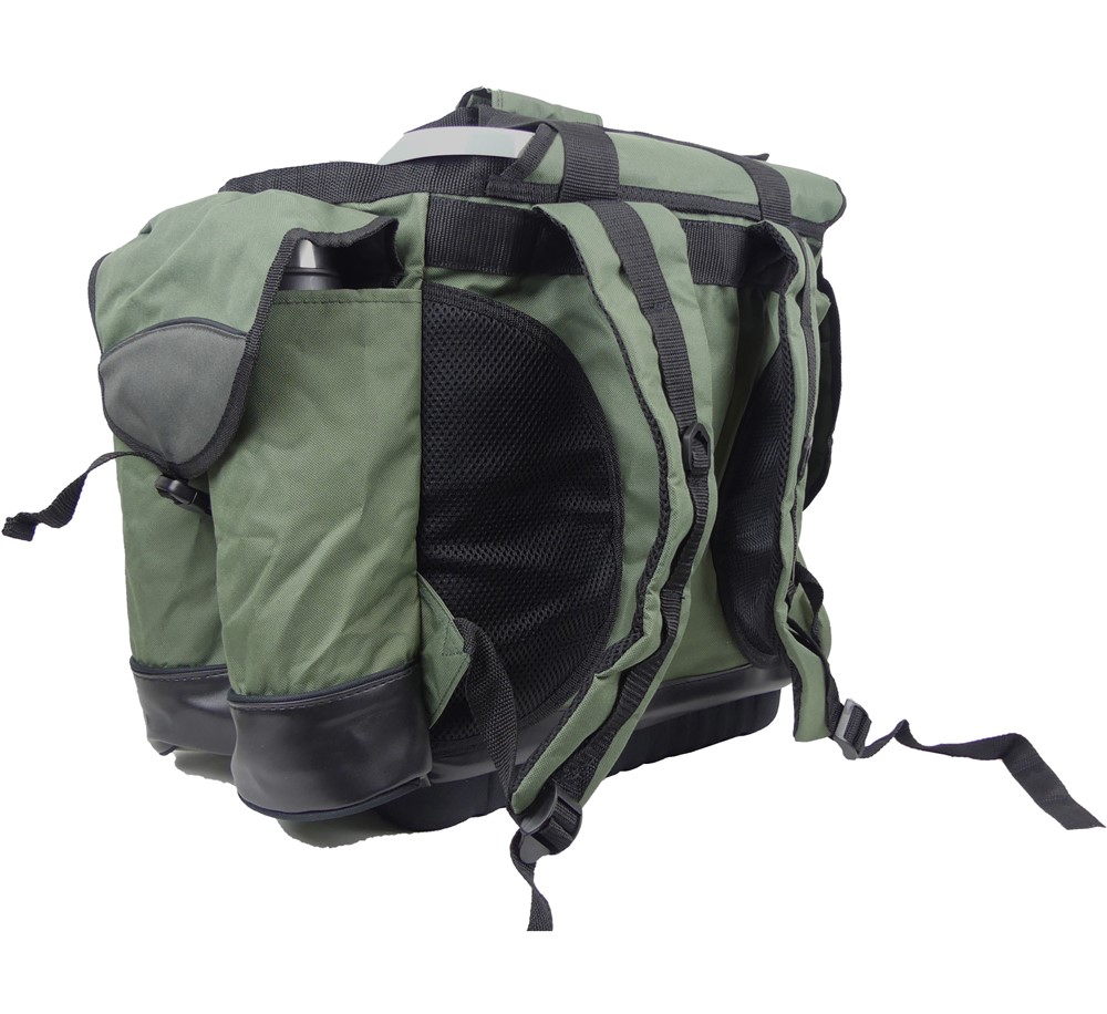 Fiskesäck i populär modell som ofta används vid pimpelfiske. Består av tygsäck med utvändiga fickor som har plats för mycket tillbehör och en plastbehållare med lock för förvaring av fisk eller annan utrustning.